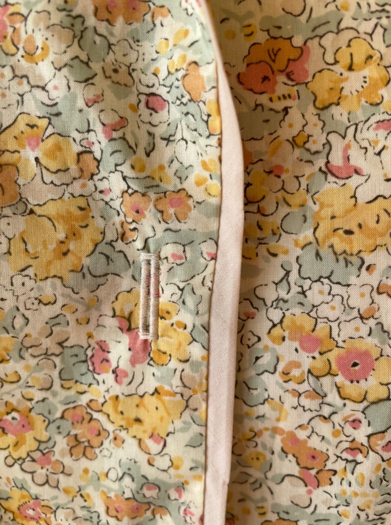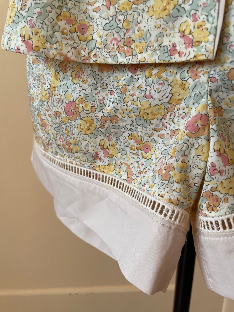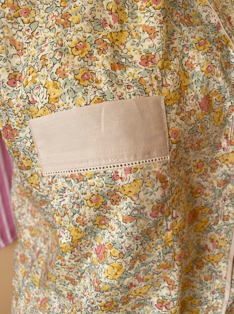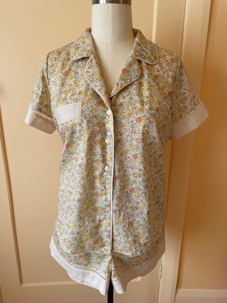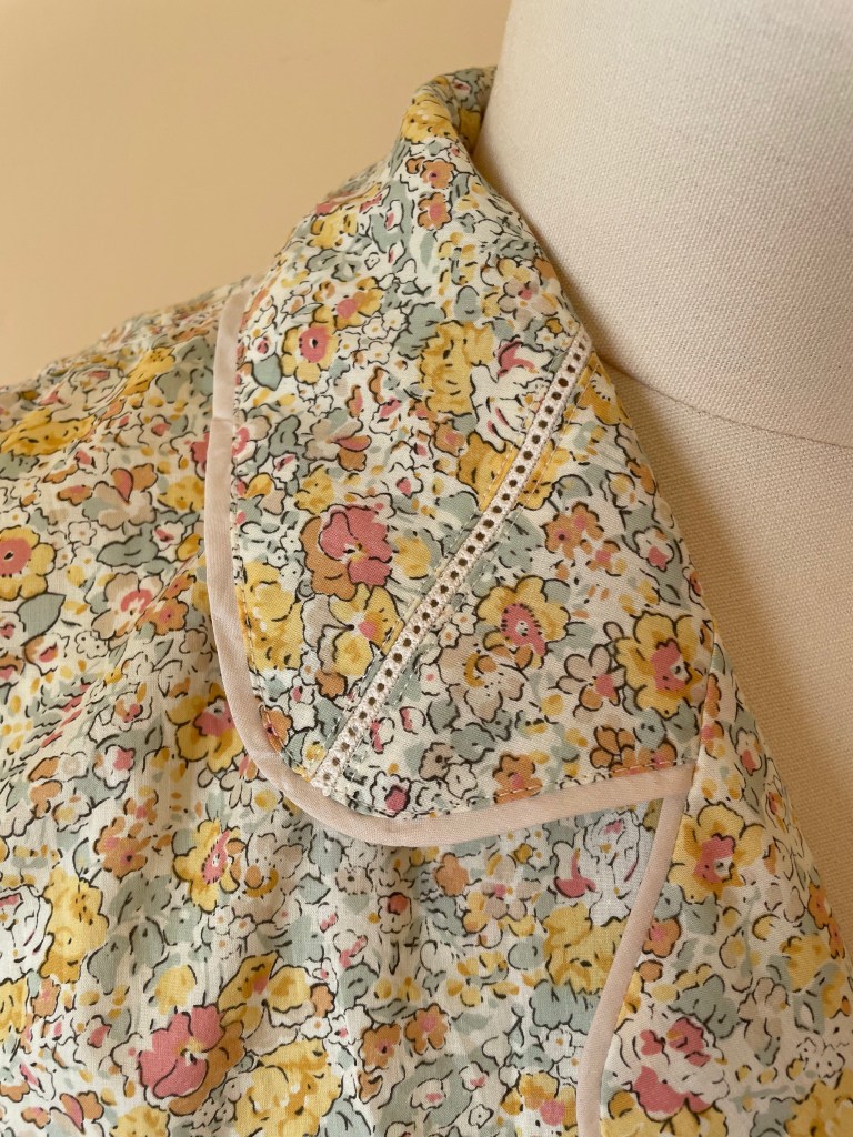 I bought this Betsy Liberty fabric before I got married, always with the intention to make pajamas with. I recently bought a bunch of different Entredeux (fagot) trim and was not able to use as much as I was hoping to – after discovering that the trim did perfectly match this fabric, these pyjamas skipped right to the front of the sewing queue!