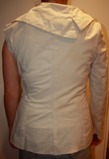 In order to get the right size from the pattern, I measured the seam lines of my favourite RTW jacket. I cut a size 20 at the shoulders, tapering down to a size 14 at the bust and down the torso (I have broader shoulders than the patterns of today allow for). This seems to fit pretty well in the width across my back, but I needed to adjust for a sloping shoulder.