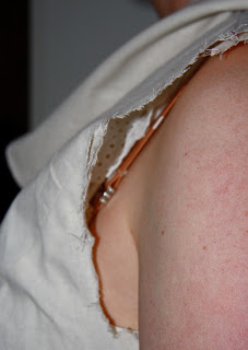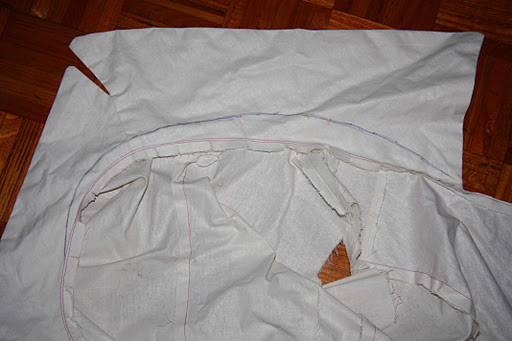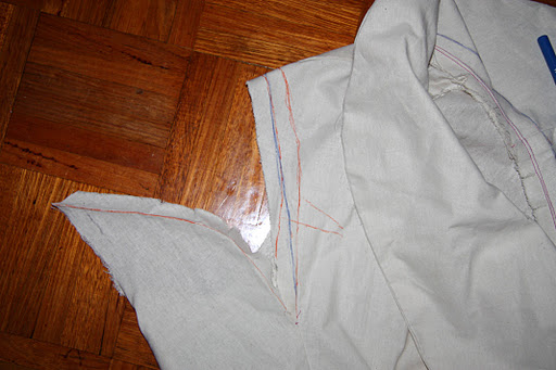 3. Using the ‘tip’ of the fabric left over after pinning – I made a mark in blue (the original sleeve head point is marked in grey) indicating the new shoulder seam point: