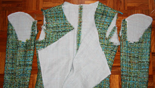 See how the sleeve caps look a tad droopy? This is totally exaggerated by the fact that it’s on a coat hanger (OK, I was actually trying to make them look that way – the fabric actually sits relatively nicely when I try it on), but I’ll be going though shoulder pads and sleeve heads shortly – and how they can affect the look of your tailored garment.