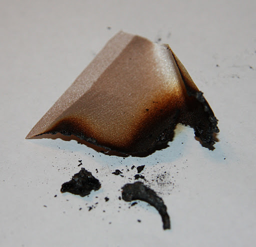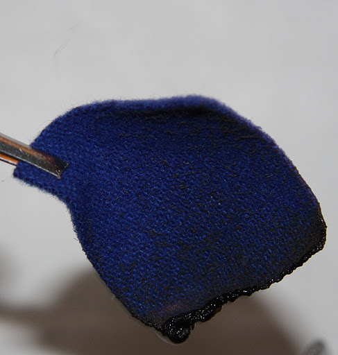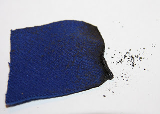 From the plant fibre family, cotton will catch alight quick smart with a yellow flame, smelling like burning paper and having an afterglow when you take the flame away. I wasn’t quite quick enough to get this all in the frame, but you get the idea. The singed but not burnt cotton fragments will be browned, a bit like toast thats been overcooked, whilst the ash will look soft, fluttery and disintegrate on touch. Heavier weighted cotton like the blue fabric piece singe more and produce less fluttery ash: