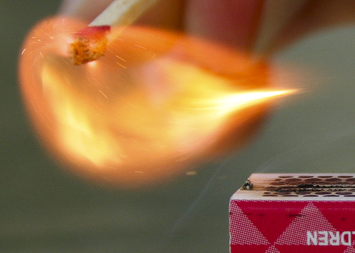 Also from the plant fibre family (the flax plant), linen burns slooowly with a yellow flame similarly to cotton but which is slower on the uptake. Definitely the easiest burning specimen to photograph. The dead give away? The burnt fibres will keep their woven shape: