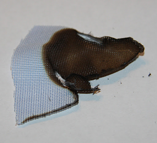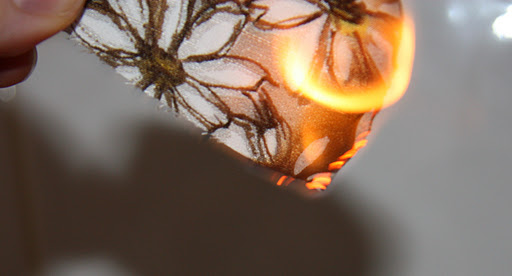 Silk is actually a protein, and smells a bit like burning hair when put to the flame. It burns very quickly, but the slightest touch of a breeze and the flame is put out. I wasn’t quick enough to get a photo of this burning, but burnt silk hardens and leaves black beads that crush very easily between your fingers: