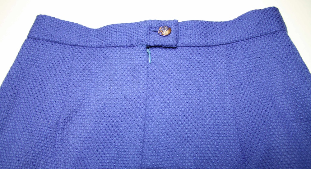 I found that had I left the length of the waistband as per the pattern (a size 38), it would have been too long. I cut about 6cm off the end – a much more manageable length! I ‘stitched in the ditch’ along the front leaving the seam allowance flat, reducing the bulk inside the waistband. The wool blend fabric was quite thick – so this worked perfectly, and the texture of the fabric meant that it’s nigh on impossible to see the ditch stitching at the front.