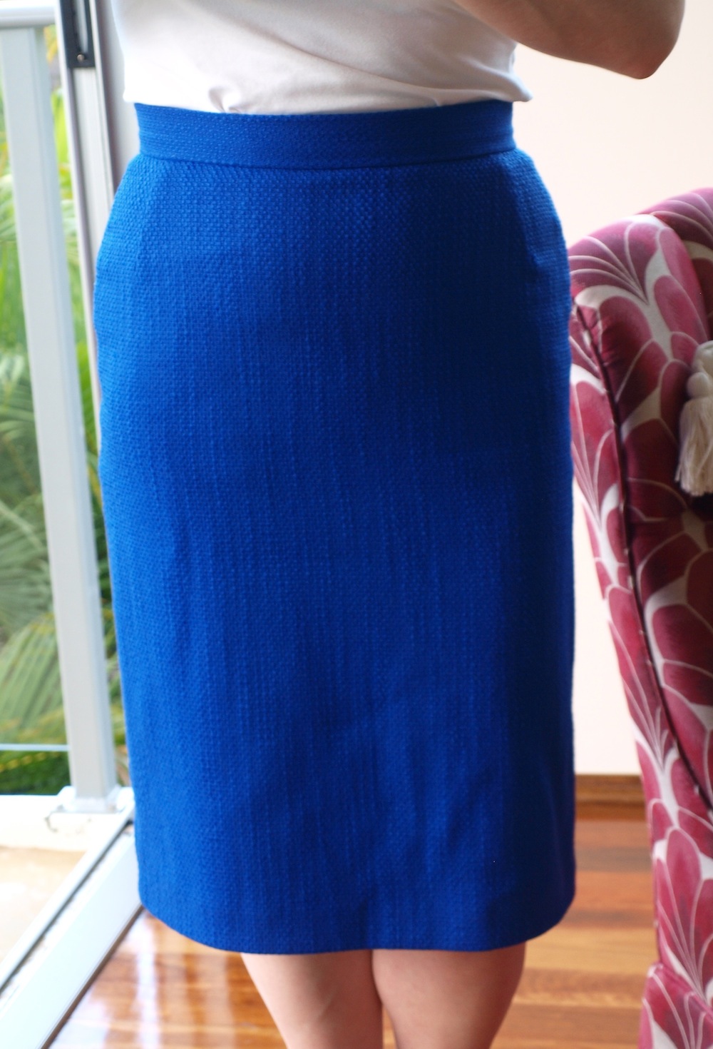 The fabric was a gorgeously soft royal blue basket-weave wool and nylon blend, by Alexander Wang and bought from EmmaOneSock. Beautifully thick and perfect for winter – lined in my favourite lining fabric – a black habotai silk. Shame I couldn’t get a zip with a colour to match quite properly… but one does the best with what one has!