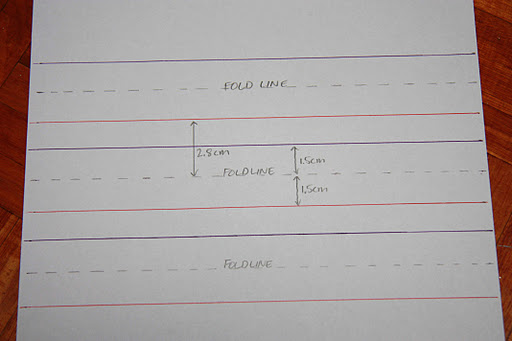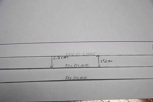 The dotted line represents the centre of the pleat, the red line the bottom fold, and the purple line is the stitch you would see at the top.