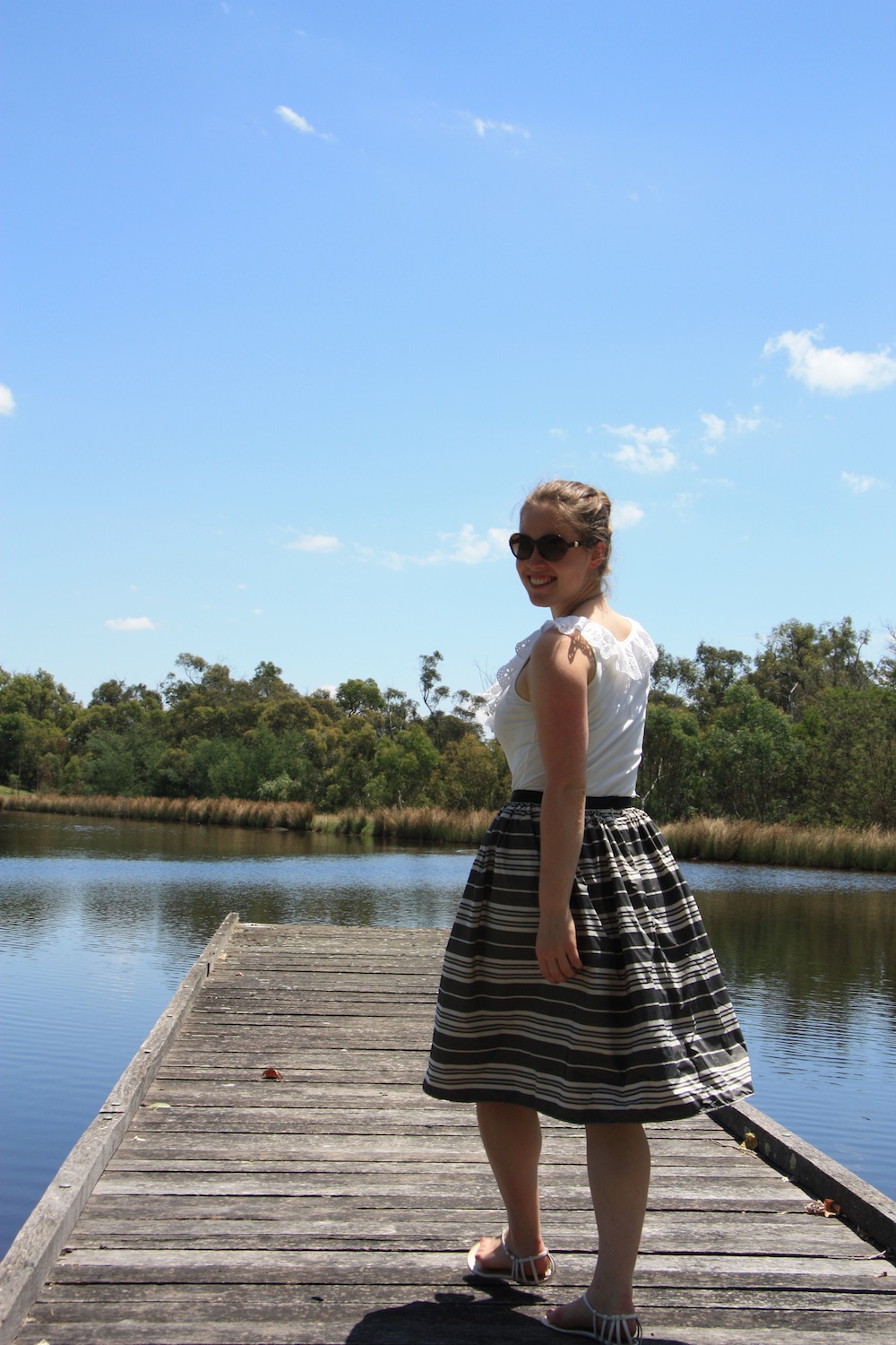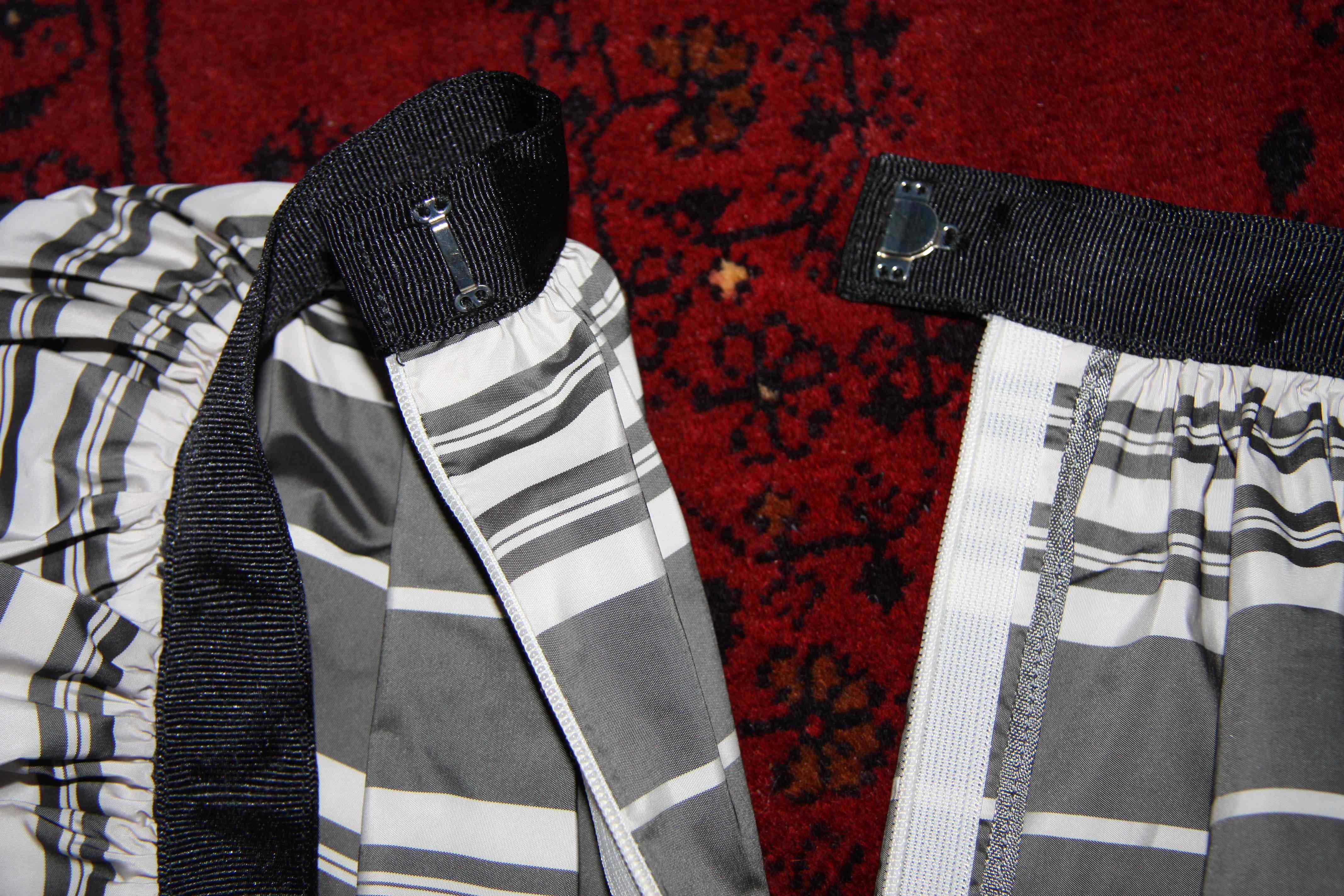 I made this skirt in a single sitting – a world record for me. No toile, no seam ripping, no swearing, just instant satisfaction. I bought this grey and white striped taffeta (about the first wholly synthetic fabric I’ve ever bought…) from Tessuti, and used a black grosgrain ribbon for the waistband (23mm wide) from my usual ribbon supplier – Ribbons Galore.