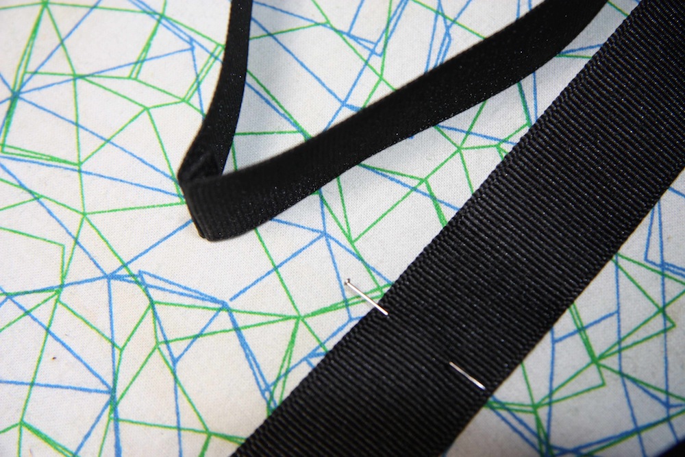 6. Take the folded half way mark and slot one end of the fabric in it – pin to secure. The little plastic nub should sit just underneath the ribbon: