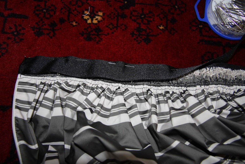 Then start pinning your gathered fabric to the ribbon that will be on the inside, spreading out the gathers so they’re fairly even. Yeah, you probably could get technical and mark the half way and quarter points on your fabric and match them up on your ribbon, but I’m just eyeballing it.