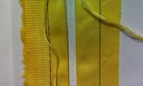 1. Firstly, you’ll need to secure the two bits of fabric you will be fagotting together equidistant apart. I’ve done this by drawing two lines (0.5cm apart) down a piece of paper, then sewing my fabric to the paper with the folded edges aligned with the drawn lines: