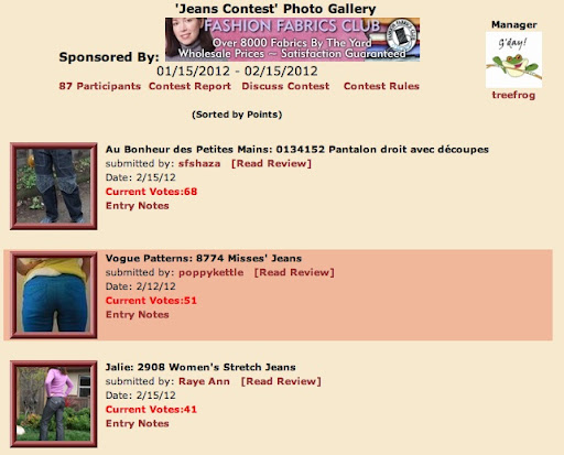 2. Congratulations Mel….! I saw this last night on PR….. I totally don't get how the winning one got there… I wouldnt wear those jeans in a fit!!! They didnt even have a real fly????? Yours definitely deserved to win! Totally loved them!! And you were so brave to put your but out there!!!!! :) But yay for a fabric voucher! Can't wait to see your next project! :) Lou xx
