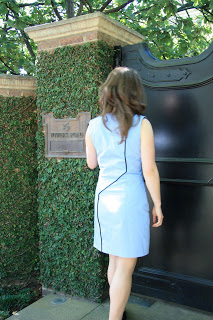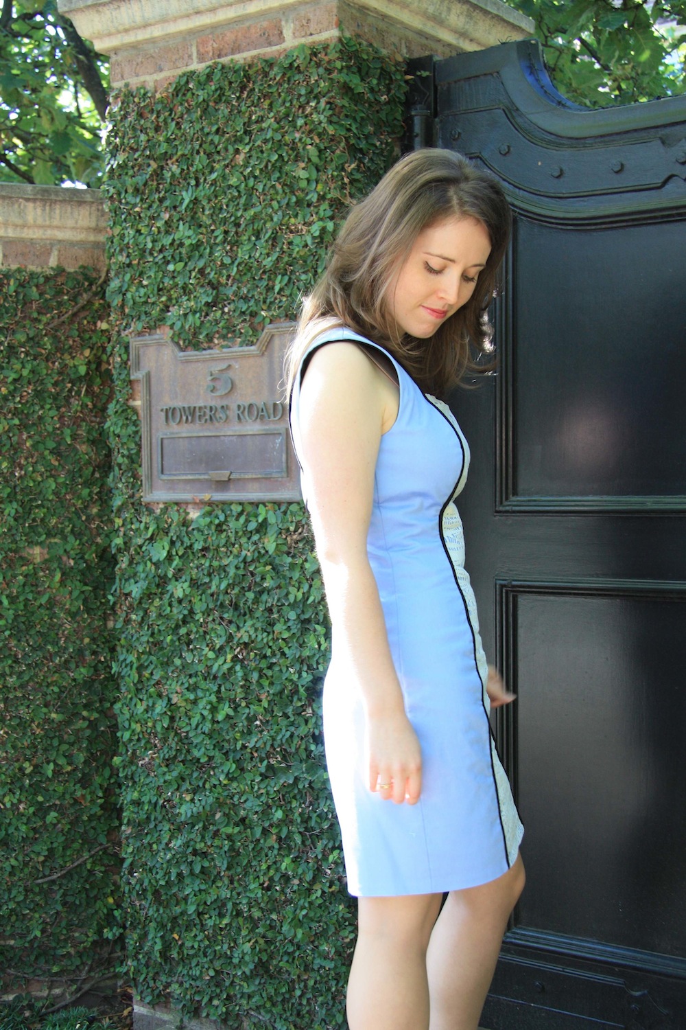 Melanie, this is such an awesome dress. The piping, the lace, that fabulous blue – it's all lovely. What you did with the seams in the back is such an interesting touch! Hope you're having a wonderful time in Ecuador!