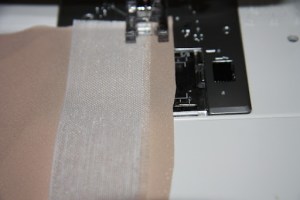 3. Line your Belt Backing up with the fabric’s edge, right side up. I’ve allowed the standard 1.5cm seam allowance here, and I want the first fibre parallel to the edge to be about 1cm away. Sew along as close to the mesh as you can – ensuring your machine’s needle doesn’t stray across into the unpicked area of the belt interfacing. It won’t be fun if you let that happen.