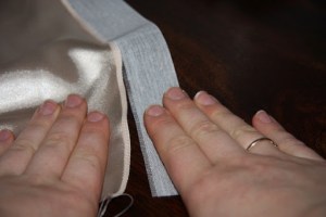 5. This part is important – pulling willy nilly could potentially stretch out your bias and make it ruin all the work you’ve just done. I found that out the hard way. So gently, holding the fabric and belt backing with your hands parallel to one another, pull the belt interfacing out of your hem.
