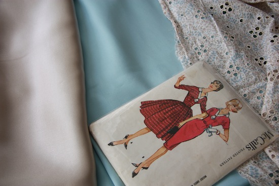 Also from The Fabric Store, some oyster coloured silk satin for lining, plus some delicious baby blue silk/cotton voile bought specifically to underline the eyelet fabric on the right (bought previously) to become a Mad Men/potential SewcieTea dress: