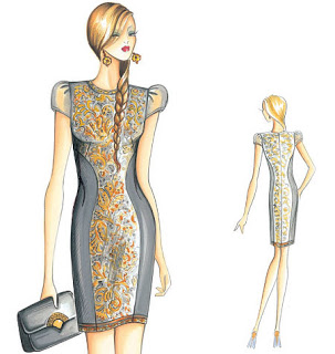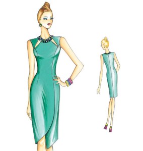 | F3149 – Mini-dress with amphora cuts that hug the figure. Suggested fabric: velvet and lace or satin and patterned fabric |