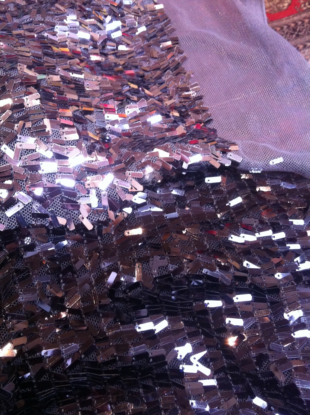 6. I just spent the last four months sewing with sequins… the little buggers are everywhere! On the floor, in the tub, my sister found one in her purse – I even found one in the refrigerator! So I would say to expect it to be messy. Very very messy. As for cutting – just use scissors (do you have a second best set of scissors? Use your second best set if you can). I have used/tried a rotary cutter and it works alright but it dulls the blade quickly. As for the thread – just use whatever you normally use. It will be fine. For a needle – if the sequins are on a jersey/knit fabric (can’t quite tell from the picture) I would use the largest ball point you can get (usually size 14), but if that isn’t working go for a size 16 sharp. I had a lot of broken needle problems, but the size 16 punches through everything! You might experiment with using zig-zag to do the main seams (sometimes it helps the sequins lie flatter, sometimes not; depends on the fabric). Also I highly recommend finishing off the seams on the inside – you can figure out what works best for you – because if you don’t the sequins will cut you into a bloody mess (ask me how I know…). Some people pick the sequins off of the seam allowances, but I don’t like to do that because I worry about them unraveling from the right side of the dress. Also, it isn’t worth my time. A lot of people tell me I am crazy because sewing with sequins is “so difficult” but it isn’t really. The sequins themselves don’t stretch, so they make the fabric act more like a woven, even if it is on a knit. You may have to stitch a bit more slowly to avoid skipped stitches (my old machine had this problem, my new one does not). Oh, and whatever you do – DO NOT USE YOUR SERGER! That’s a mistake I made once. And paid dearly to replace the serger blades after…