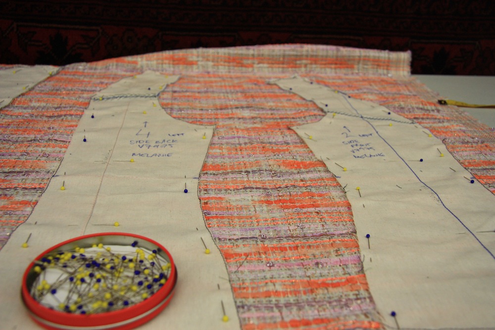 We take apart out muslin’s, make the necessary adjustments and hand sew everything flat, cut off the seam allowances and get to positioning on the fabric ready to cut out. Depending on the fabric choice, this can be quite a challenge – some fabrics have quite distinct repeats (either vertical, or horizontal or painfully…. both), others have obscured repeats, some fabrics have nap.