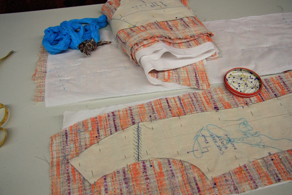 I position my fabric then (deep breath) cut it out, at which point I add in my batiste underlining (which has been spritzed and steamed to within an inch of its life to both pre-shrink and soften it). Then it’s basting time.