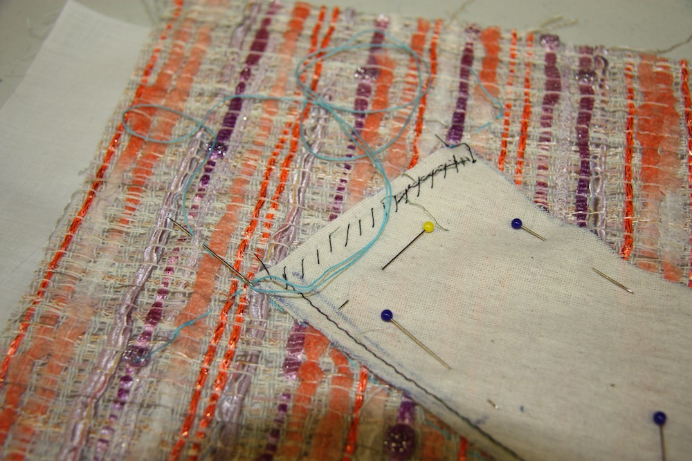 Japanese cotton is the best – it’s ‘grippy’ but smooth at the same time, whereas silk in this particular circumstance would be too slippery. This transfers the location of the seam to your fabric. Obviously you can’t draw it on with chalk… unless you’ve been practical and gone with a tightly woven boucle with even sized threads, of course.
