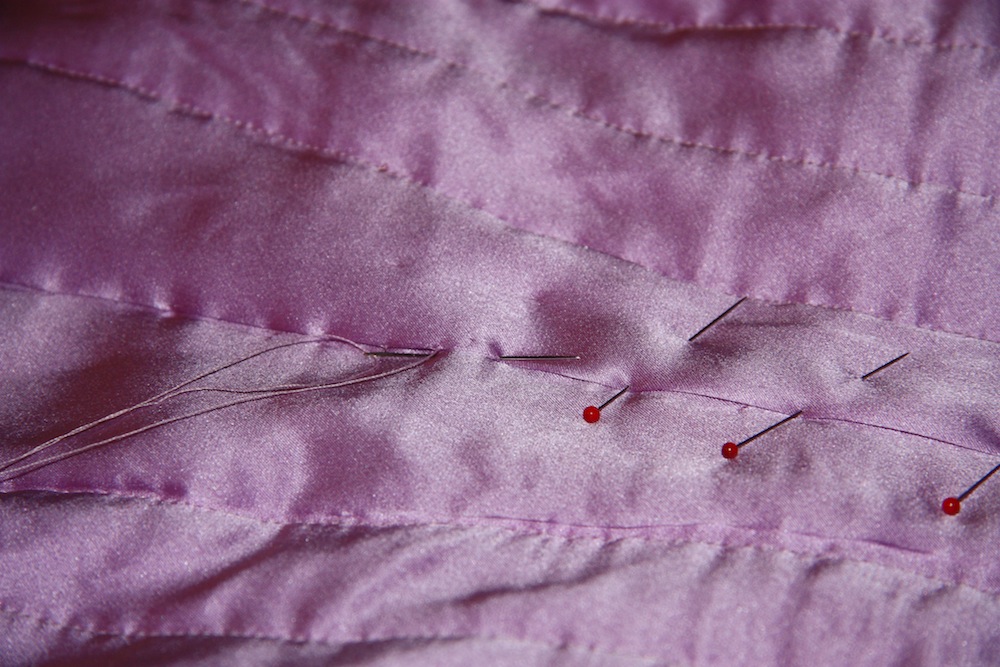 Susan marks the spots of the new stitch lines and sends me back to re-baste, pin and sew the adjustments – I also add in a few more quilting lines now I have an extra inch of ease at the side seams. Quilting when the jacket pieces are joined is not something I would recommend….