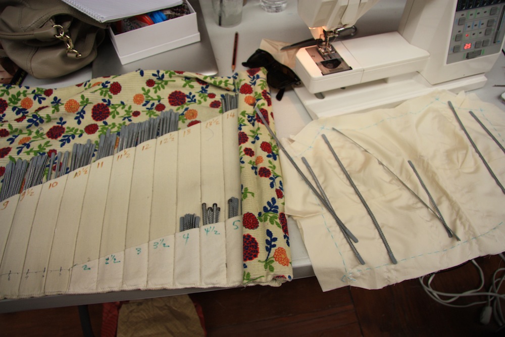 There’s going to be two layers of cotton here, which are sandwiched wrong sides together then sewn along to create the boning channels. Once it’s together, I get to play with ‘Bone-o-rama’ (the name of Susan’s case carrying the pre-cut lengths of steel spiral boning):