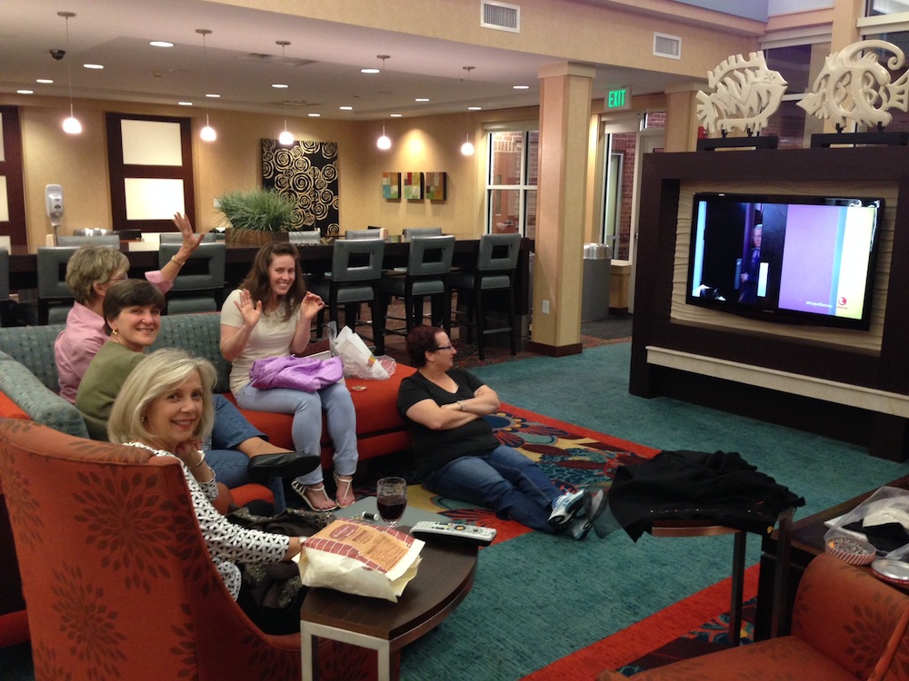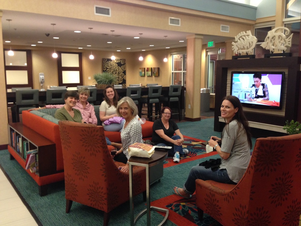 As a bunch of us were staying at the same place, that night we organised to get together in the lobby to watch Project Runway, so I thought I’d have a night off homework (and to be fair, I was starting to feel a little thin on the ground…), but then  came downstairs to find Sarah busily sewing away on her French Jacket and Leisa sewing as well, so I raced back upstairs to grab mine in the add-break for a little sew-in in the lobby: