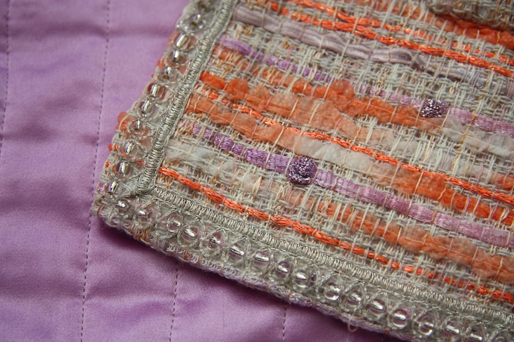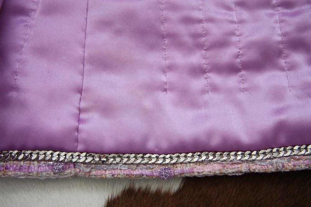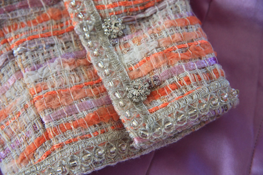 The fabric is a loosely woven Chanel boucle, bought from Mendel Goldberg – and the reason I figure I can get away calling this post what I have. It’s lined in a lilac silk charmeuse from B&J fabrics, and my trim – bling-y buttons and a silvery grey beaded thing was from M&J Trimming, all from New York. I was originally planning on having two rows of trim with potentially some orange velvet ribbon in the middle, but when it came to pinning it on the jacket, it just looked too much and the orange of the ribbon too harsh. Thanks to all the girls from Social Sewing for their general consensus advice on this matter of crucial importance! So, one row of trim it was.