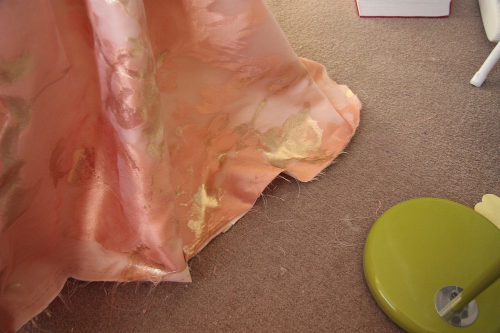 Ah, hemming. Usually my most loathed sewing activity, but on this type of garment – just a little exciting! I decided fairly early on that I wanted to have a taffeta facing for the hem, mainly because it just gave such a wonderful shape to the poly taffeta I made up a practise skirt in. Thanks to my private lessons with Vikki Leigh Martin and the mannequin I loaned from Mr poppykettle’s brother’s partner’s mum (you figure that out) the hem location was worked out during muslin phase, so it was pretty easy.