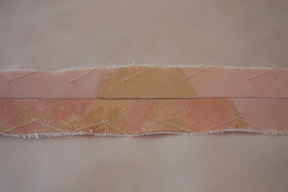 Using a machine gathering stitch (with the strongest thread I had – poly cotton) left marks on the organza overlay fabric, and I was worried that if I did the two requisite rows of machine basting stitch for gathering that the holes would be visible once the thread was removed. As Bridal Couture predicted – the taffeta is so tightly woven that even on my machine’s longest stitch (5.0mm) I struggled to pull it through. I hand basted two rows instead with silk thread, and incorporated a single pleat fold on each side. With a bit of finger nail scratching and some judicious use of iron steam, I managed to coax the silk organza threads back to their positions pre-basting stitch.