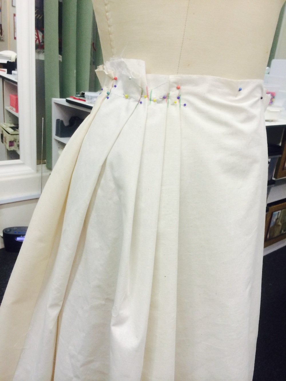 We then slashed each of the three skirt panels down the centre and along the grain line, adding in additional strips of calico to widen. We pinned and pleated on a mannequin, then we stood back to admire:
