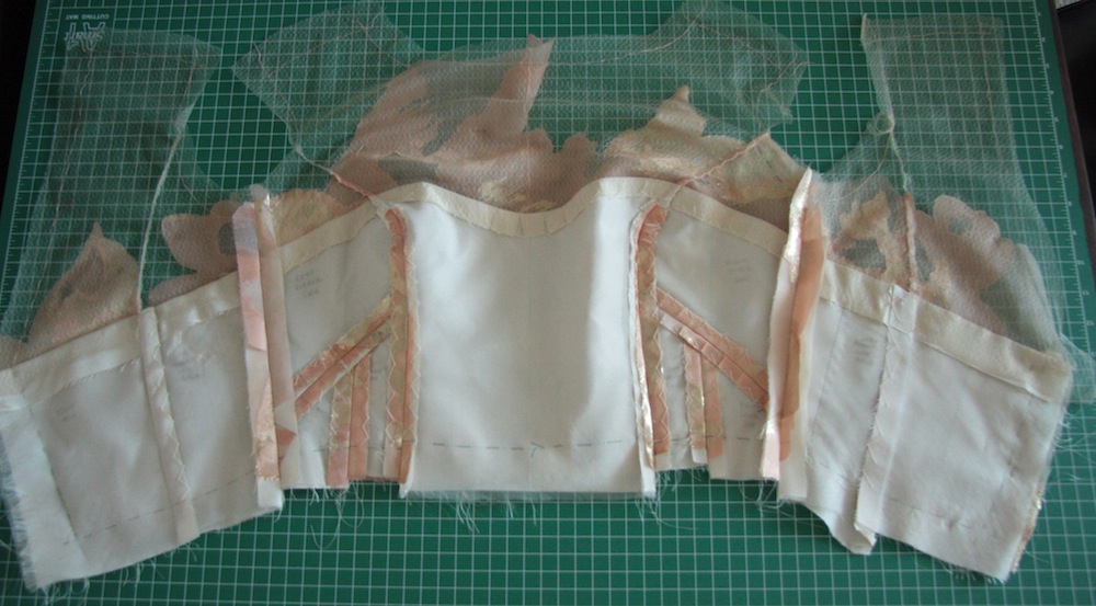 At the muslin stage I marked out the location of my bustier underneath, so I could determine where to join the souffle to the opaque part. I then thread traced the souffle and the taffeta pieces and joined them all together. Once at this point, I could play with the placement of the organza overlay – doing my best to match the more obvious parts, like the princess seams: