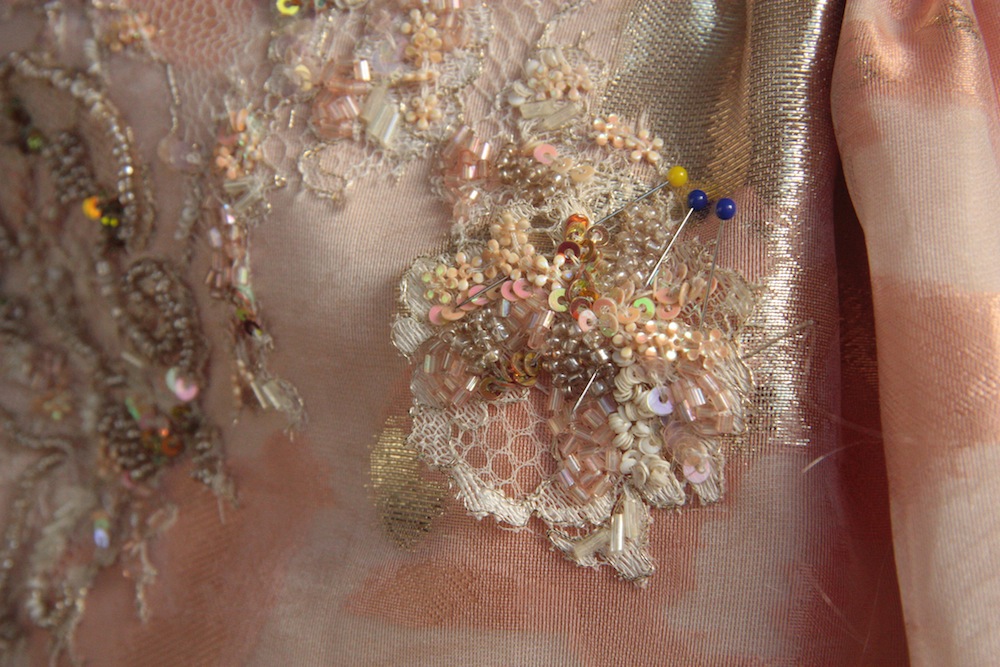 The rest of the lace was cut and appliquéd across the bodice and down onto the skirt. The shapes I cut were dependant on the lace design to some extent – in the photo below are two repeats with the bottom one turned upside down so they ‘connected’ with the same beads at the centre. The lace on the skirt is a different part of the repeat, with a few smaller shapes that I could easily cut out (without having beads going flying off in every direction) to try and make the placement look a little more organic.