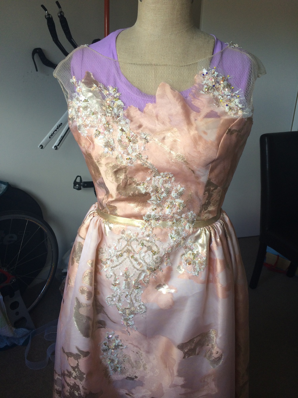 I started on the bodice and worked my way down the skirt. I sewed this on over the course of a week, again due to working with the ‘invisible’ thread it was only able to be done during daylight hours.