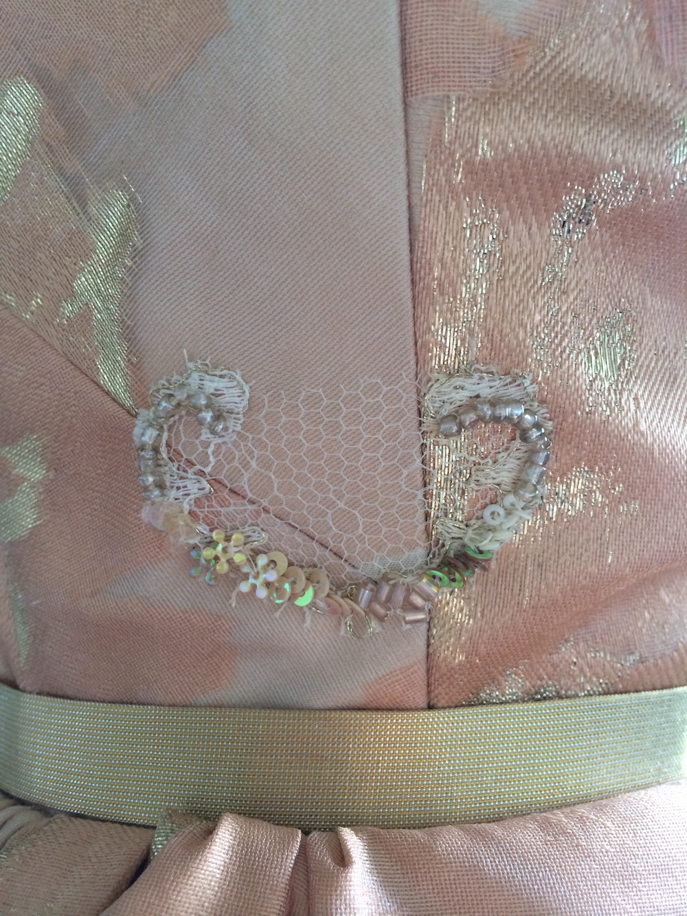 The perfectly matching gold ‘belt’. And one little spot where my organza placement didn’t quite cover the piece. The result of piecing with scrap! This later got an applique and lace over the top to hide it!