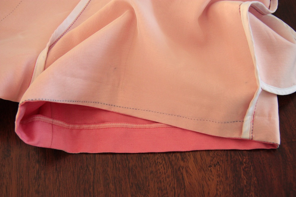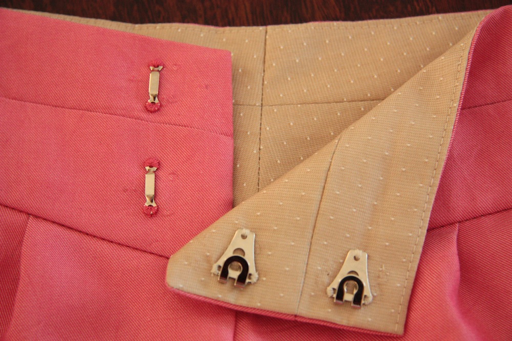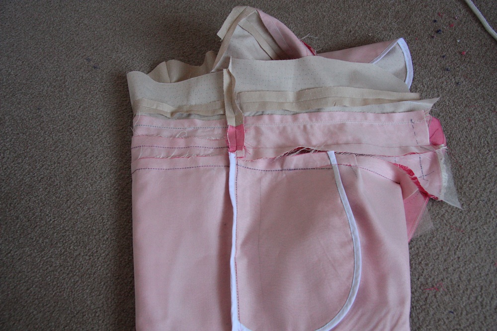 And the fabric I’ve had kept specially for these – a hot-house pink silk twill from The Fabric Store. It’s lovely stuff – beautiful sheen and incredibly soft and smooth, yet so strong! I ended up sewing these using ‘couture’ methods, mainly because after throwing the silk twill in the washing machine, it dried incredible creased. I was kind of hoping that the silk organza underlining will mitigate a small portion of the propensity to crease to make ironing them a little bit easier! I’ve worn them a few times now and this has definitely helped.