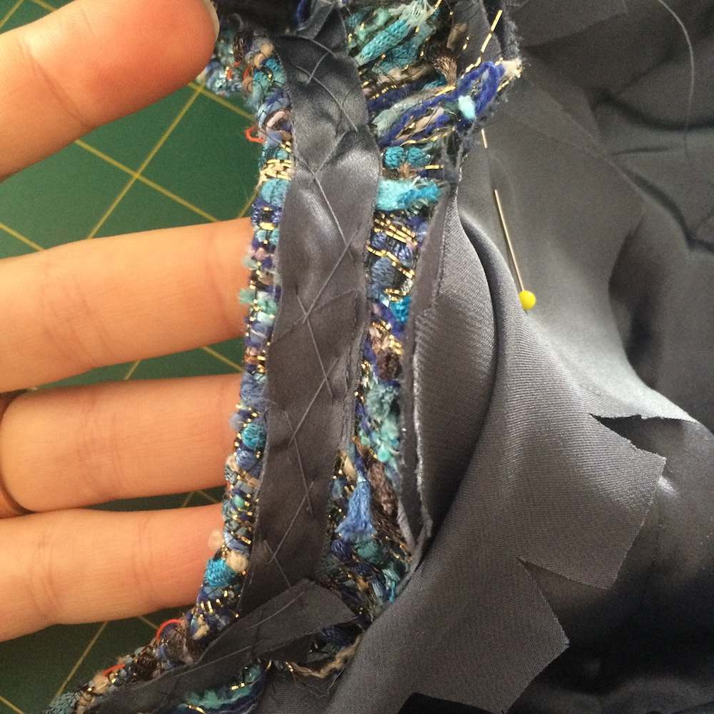 But, the trim is a huge part in stabilising the seams around the neckline and jacket front – so going without meant providing this stability on the inside of the jacket. I cut some selvedge from the silk lining, and catchstitched it in place: