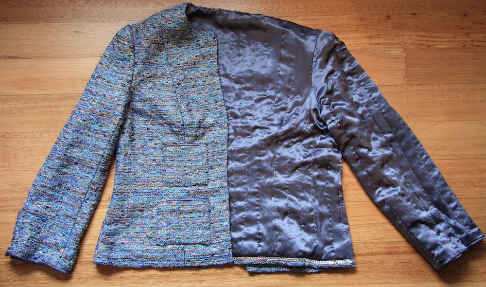 I ordered hooks and eyes and chain from Susan’s website, and after a final fitting with Mum in early July to determine pocket size and location, I finished the jacket and sent it off – it arrived about 3 or 4 days before my parents left on their holiday – perfect timing? I also sent her the remaining silk charmuese lining, as there would be enough to squeeze a sleeveless blouse from if she wanted.
