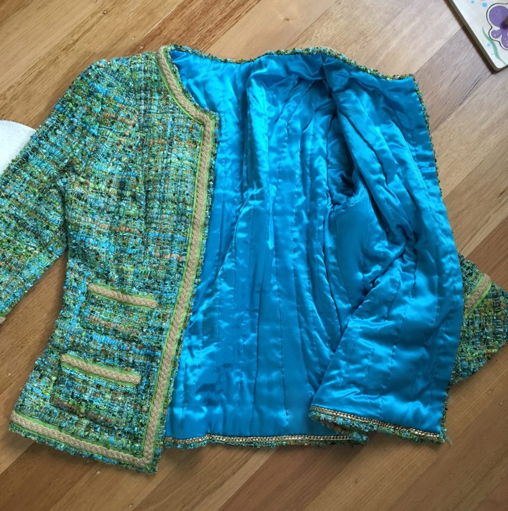 The fabric is a silk boucle, lined in turquoise charmuese (from Stitches to Style). The trim is a chartruese grosgrain ribbon from Jimmy’s Buttons which has been painstakingly cut down to the width I wanted (I could only get it in a wider width) – paired with a vintage Chanel trim Susan Khalje bought in Paris then lugged all the way to Melbourne as a potential option for her students to buy in her 2017 Tour of Australia. It was a particularly long length, and I get super excited when I spot the other ladies who bought some – sisterhood of the trim! Sewing it on made my hands smell like a hessian bag.