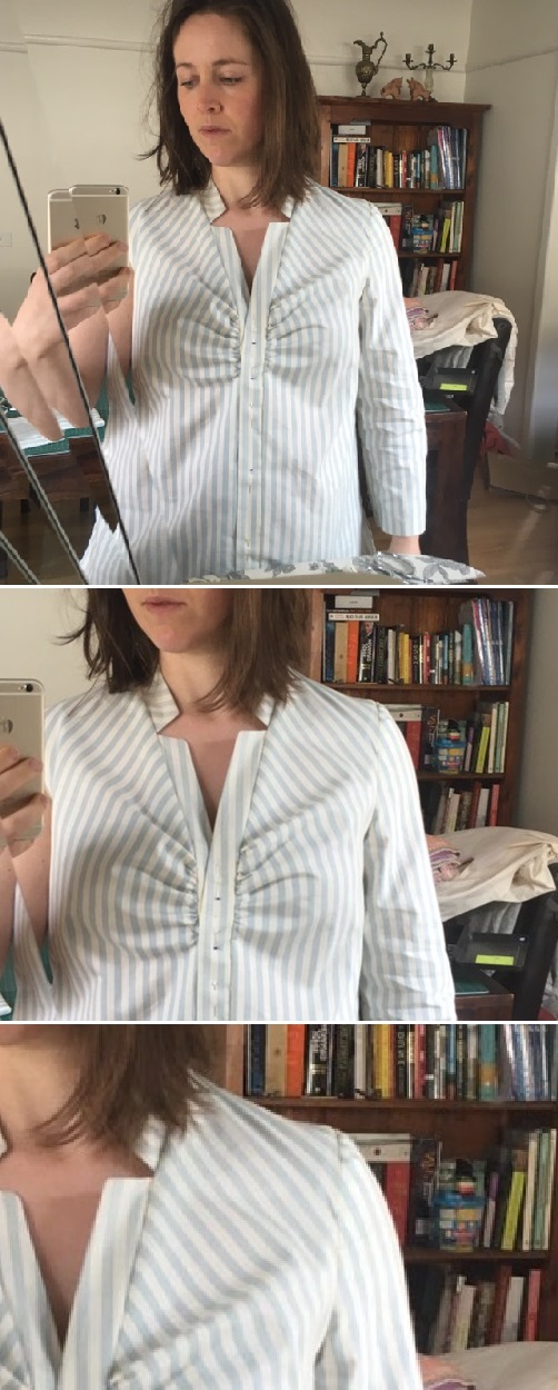 I will definitely be making this again when I find the striped cotton shirting fabric I have in my mind – because the stuff I used for my muslin shows just how well this pattern can show off a stripe. I love the way they curve around the bust and point up towards the collar. Perhaps some might find this unsettling?