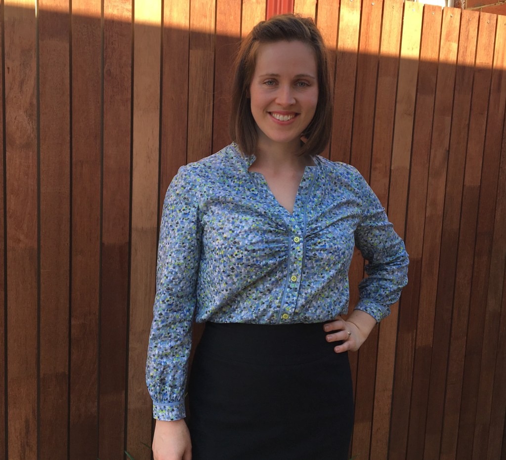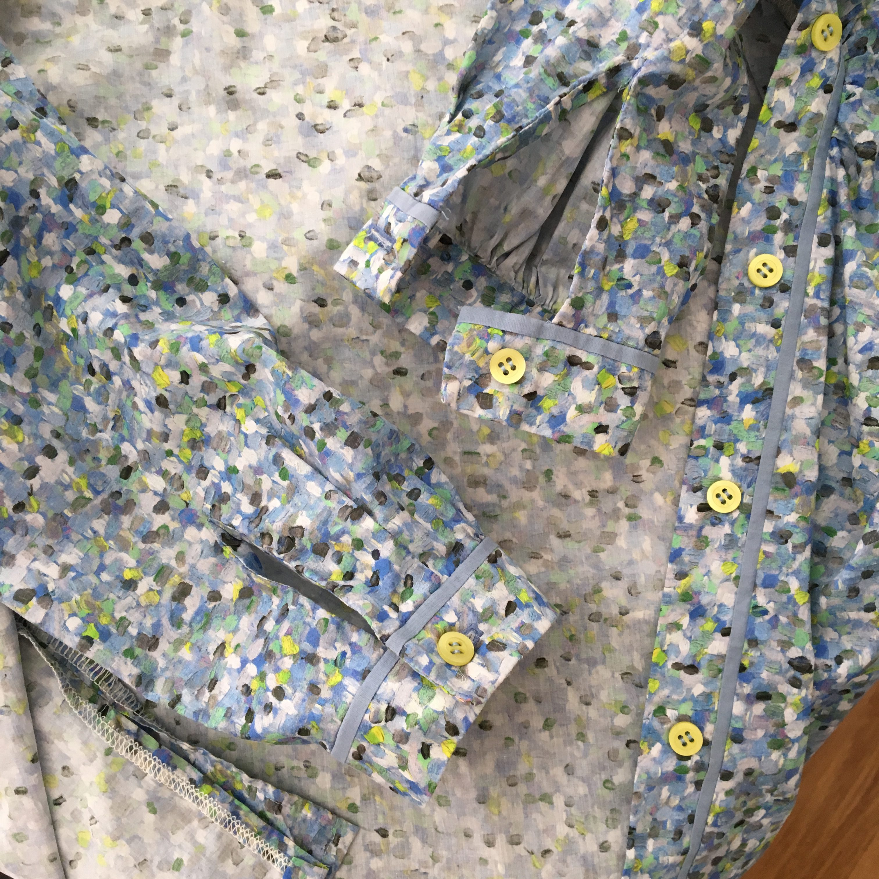 It has a cuff that buttons up and one of those split things (I have no idea what it’s called? An internal placket?!?), a pleat AND some gathering. I had to draft my own facing for the split-thing, but that’s fine (actually, I suspect I may have lost the tiny pattern piece for this in my messy sewing space – as the next shirt I sewed up after this one (the Wiltshire Shirt) has the same split and it came with a pattern piece) – I copied what I did pretty much exactly on my Blue Blotch Blouse (McCalls 5929, now OOP). It worked better than I thought it would. And completed, I actually love how the volume is concentrated on the out-facing part of the sleeve because of the gathers.