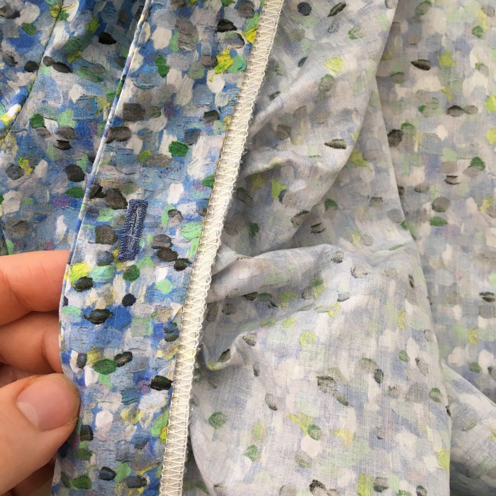 Where as the inside front is just overlocked, except for the collar/contrast facing, which I handsewed down. Not sure why I didn’t just include this in the overlocked part, to be honest!