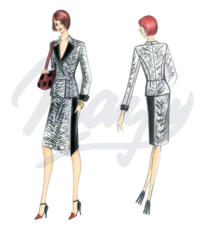 3982: “Double crossover jacket with short belt, raised collar and lapels and cuffs in contrasting fabric. Complete with two-tone skirt with V-shaped hem at the side”. I really lost sleep over whether or not to include this blazer (the skirt has me intrigued, but it’s not something I’d buy on its own). I think in the end, it looks like a safe collar option (because of all the things to sew, stand up collars on jackets are always what scare me off).