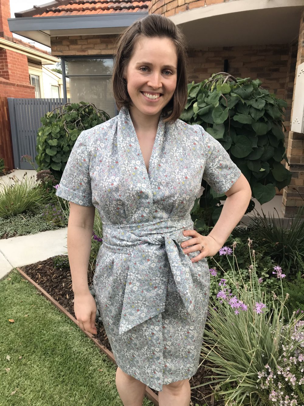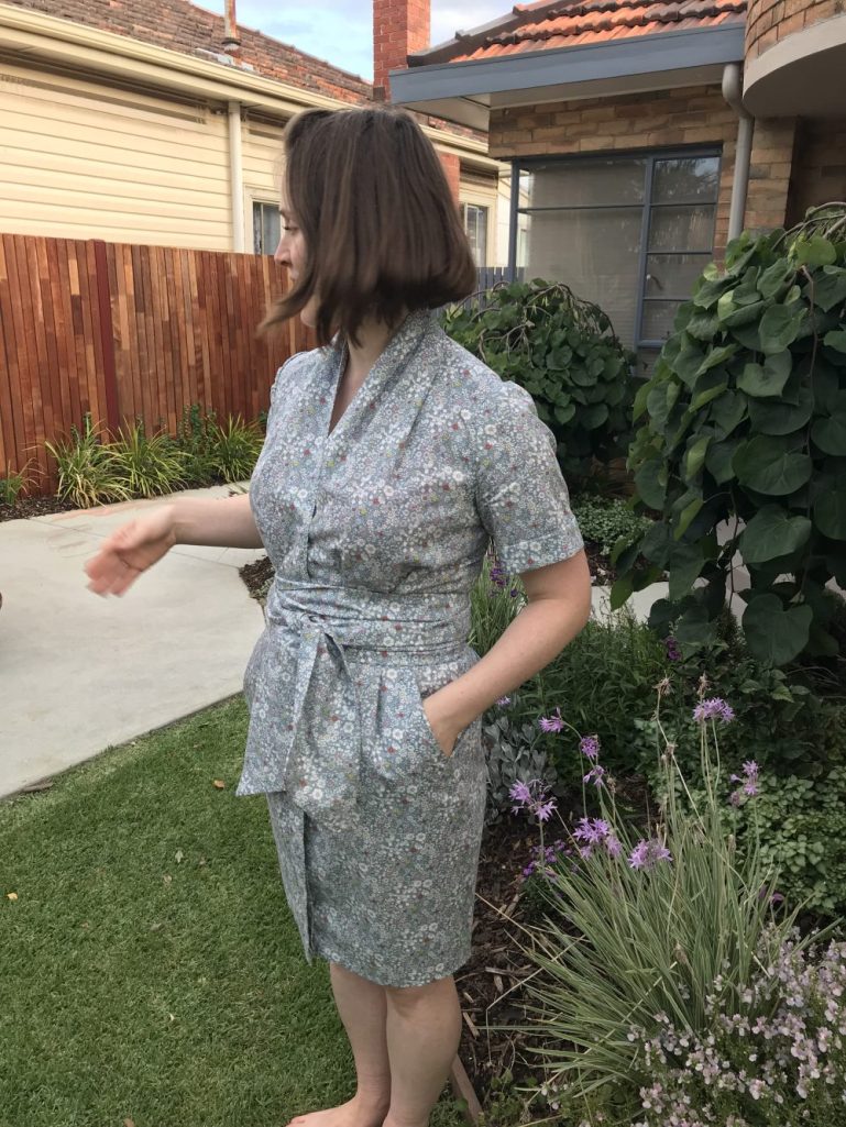 The pattern lists only 150cm wide fabric as the option (requiring a 2.7m length), presumably so you can cut the belt in a continuous piece. Liberty is around the 136cm mark, and I managed this pattern with bang on 3m. My belt is cut in 3 pieces – intentionally, so that the two seams in the belt line up with the side seams of the dress, keeping the illusion of a continuous length. Probably not something that really matters in a busy print such as this, but in my mind’s eye whilst I was dreaming it up, it mattered. It’s a huuuuuge belt though… and in my mind definitely requires’ wrapping it around 1.5 times (which is how you see it on me in this post) – the mid-point of the tie is lined up with my centre front.