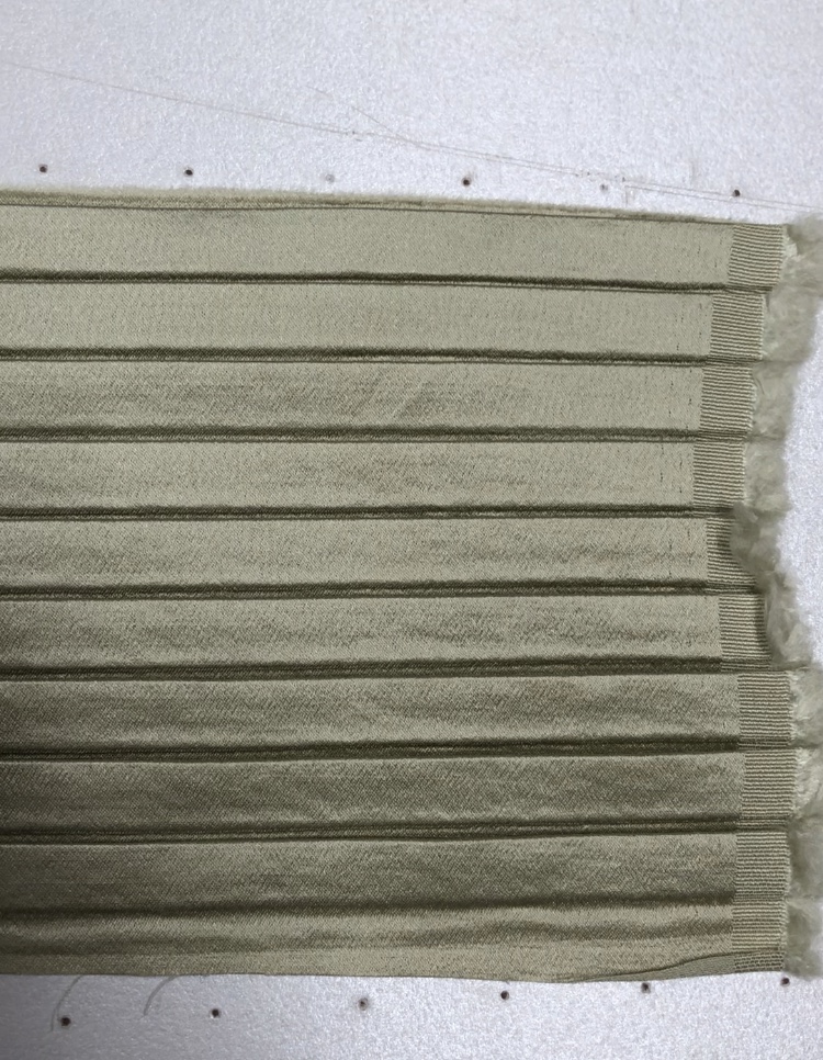 The heat and pressure create a totally different result – with machine pleated fabric having much stronger profile, compared to the softer outcome of the hand pleated method. It also appears to impact the hand of the fabric. Below shows the exact same fabric that has been pleated with both techniques as a comparison – machine pleated on the left, hand pleated on the right: