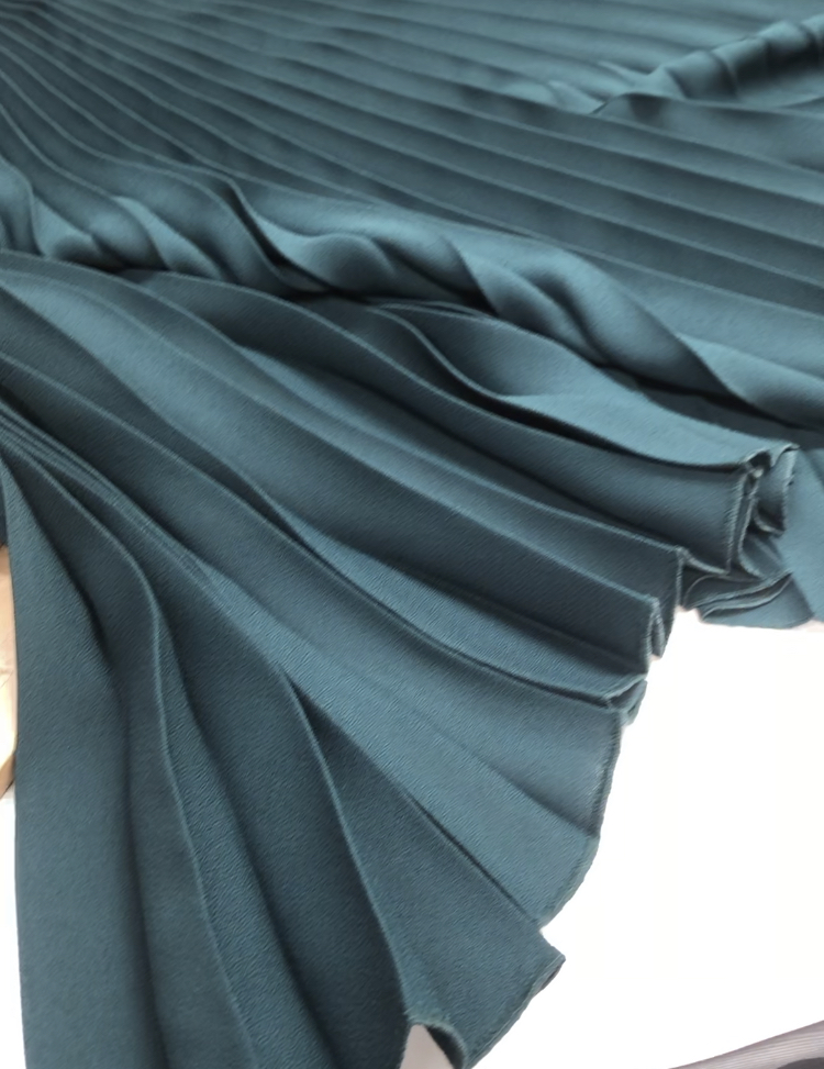 I think what has been lost in translation is that pleated synthetic fibres are far more durable – and can withstand today’s methods of ‘dry’ cleaning. There are no chemicals used in the pleating process – just heat and steam (and pressure if you’re going the mechanical route) – so for natural fibres, applying heat and steam overwrites the previous fibre memory of being pleated. Synthetic pleated fabric can be cold hand washed and drip dried in the shade – making them far more practicable for todays use. Silk fabrics can be beautifully pleated – one of Simon’s intern’s showed us a a few samples – the drape is incredible!