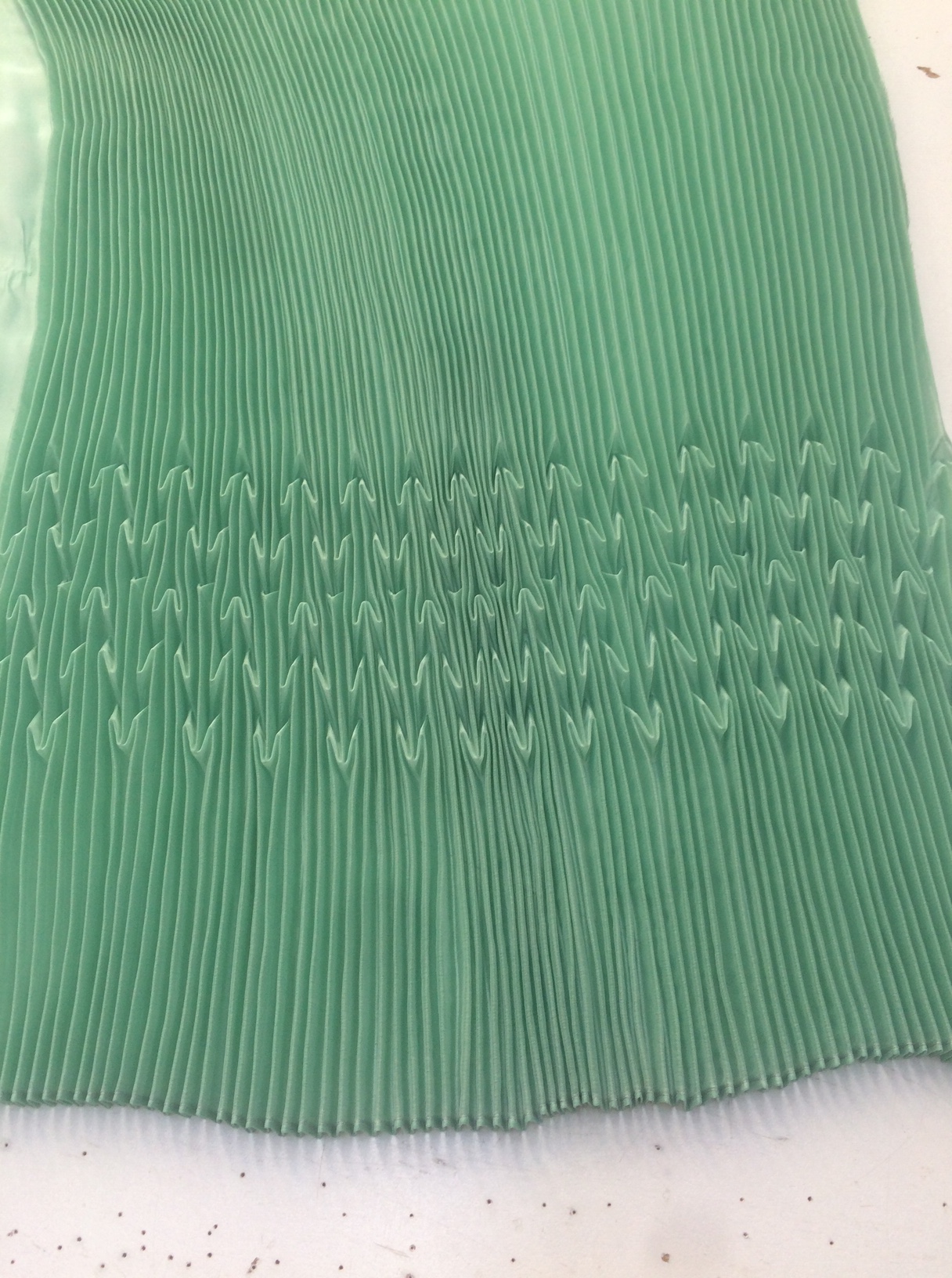 Typically lighter weight fabrics are used – like in the above left image (showing off the pleating technique that took Issey Mikaye to fame). Thicker/heavier weight the fabric can also be used – like in the above right image, however there is a need to use proportionally larger pleat patterns, meaning the fabric is unlikely to ‘snap back’ into shape like the smaller pleating. You can see how the pleats gently fold out in the teal crepe fabric. The video of pink fabric below is quite similar to the hand of Issey Miyake pleating: