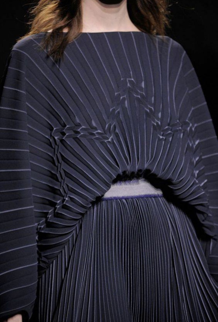 With hand pleating, the smallest you can really go is Australia is 1cm pleats. Perhaps you could go smaller, but the mold forms don’t exist… With machine pleating – you can get down to 3mm – which turns any fabric into an incredibly structured form, like below (which can only be really seen in motion).