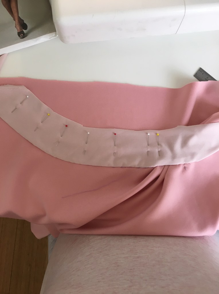 Final fitting came with pegging the skirt hem a tad (this is below the pull lines at my hips, which is more from my trying to force the fabric to wrap around my bump, rather than just hang from it, which was the fabrics preference), and adding in elastic at the side seams to make the excess fabric on the back pattern piece appear to be a design feature…