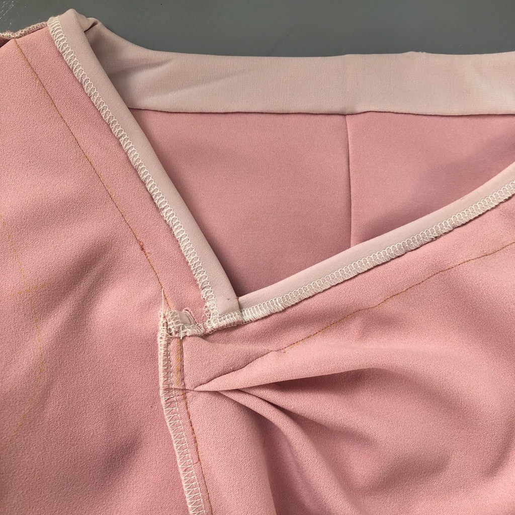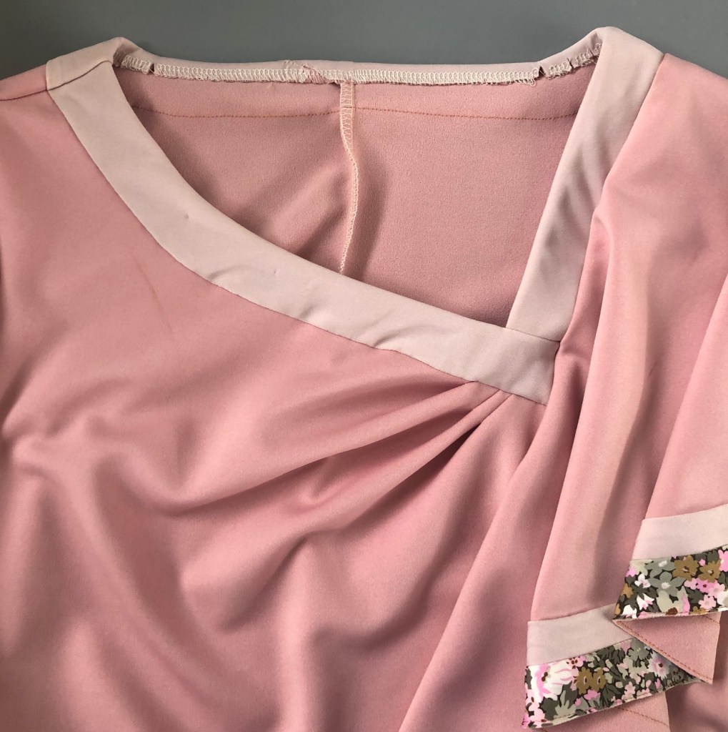 You can see the front is split into two pattern pieces, and the flounce at the front appears to be sewn into the seam that joins the two together. Except that the contrast neckline band is attached to the side pattern piece, and not the front: